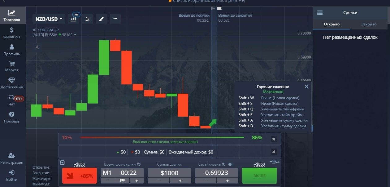 Так выглядит кабинет для торговли — выбираете актив, а потом угадываете, куда пойдет цена на него