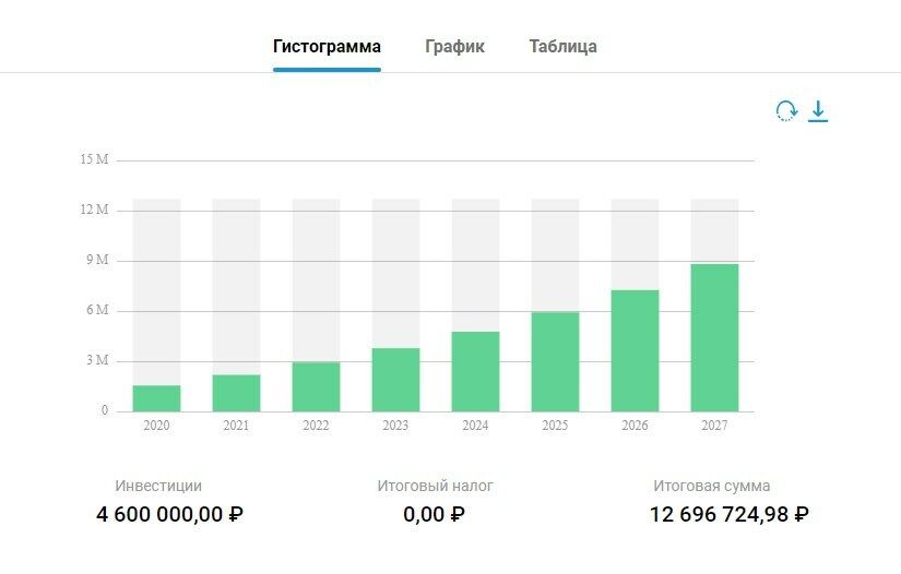 Расчеты обычно сложные — нужно учитывать ежемесячный рост цены на активы и дополнительные вложения. Можно использовать калькулятор сложных процентов. Указываете в нем первоначальный капитал, ежемесячную сумму пополнения и ожидаемую прибыль — получаете точные расчеты.