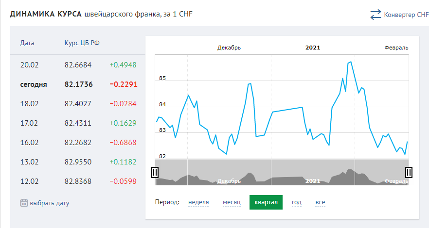 Посмотрите — швейцарский франк стабилен, но даже его курс менялся на 4–5 ₽ в течение недели